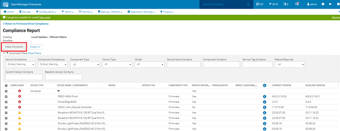 If you want to update a server, make sure the ESXi build is current, place the server in maintenance mode, and then go in OpenManage to Configuration > Firmware/Driver Compliance > My_baseline > Make Compliant