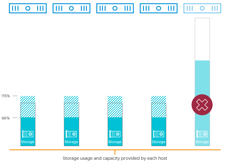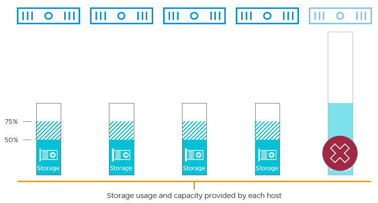Now imagine a 5-host environment with 50% utilization, but one host has 2x more storage capacity of the others. If that specific host fails, utilization would jump from 50% to about 75%.